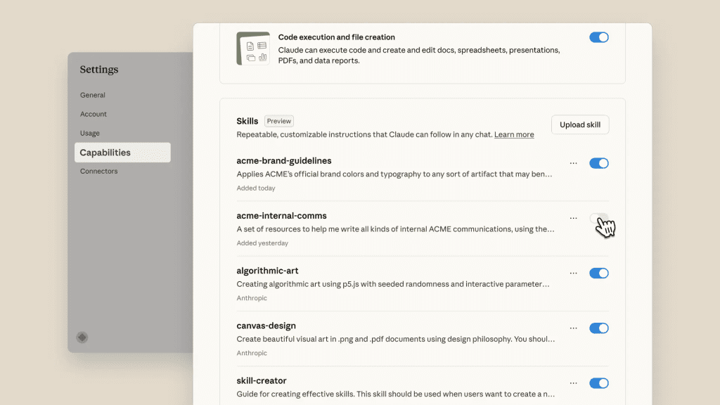 - Tool and data access: Hook Skills to file sources (Drive, Dropbox), basic web fetch, or your own API endpoints. You decide the guardrails.