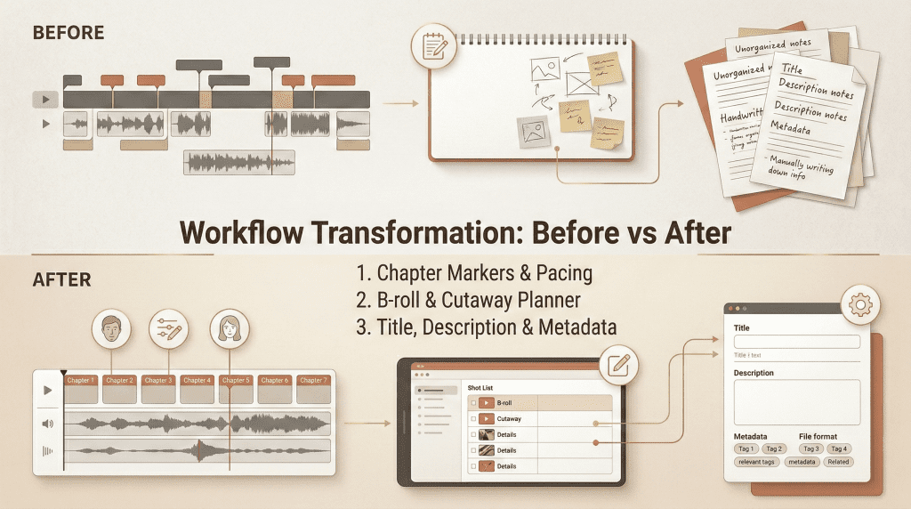 - After: I run a Skill called “Chapters‑7Beat” that expects a transcript and a target length. It returns timestamps, beat names, and a one‑line takeaway for each section. I still tweak phrasing, but I’m starting from 80% done rather than 40%.