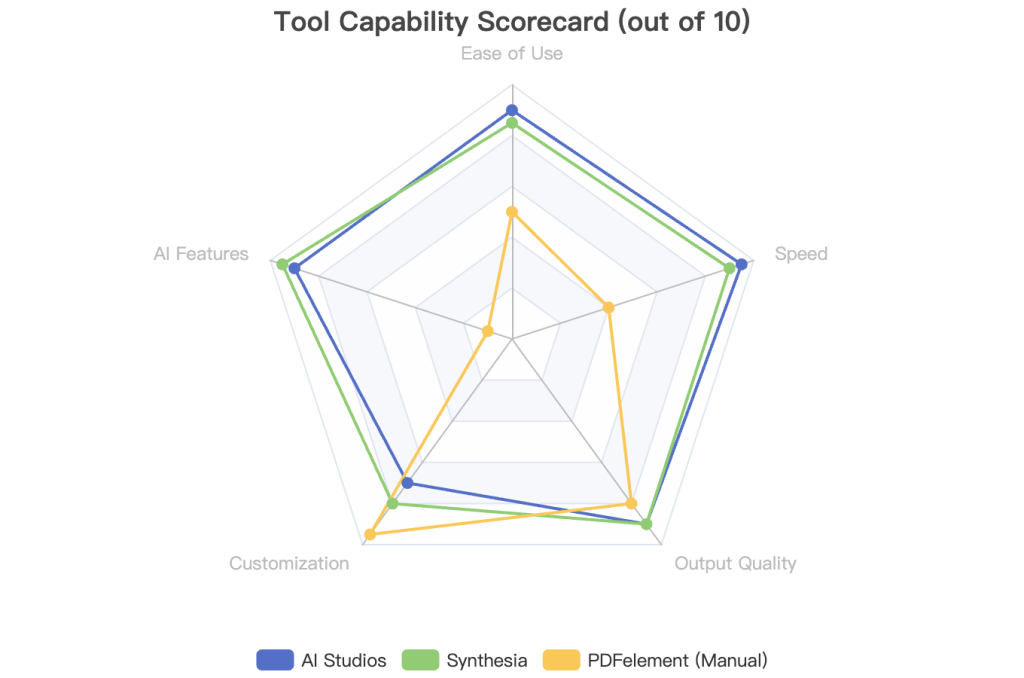 AI Studios (by DeepBrain AI)This platform is a powerhouse of AI automation. Its standout feature is the library of hyper-realistic AI avatars that can narrate your content with startling realism. From my tests, it’s the fastest way to turn a dense PDF into a professional-looking video presentation. It’s ideal for marketers and educators who need polished content without a steep learning curve. The automated workflow is incredibly efficient .SynthesiaSynthesia has carved out a niche as the go-to tool for corporate training and communication. Its strength lies in its vast selection of over 160 AI avatars and support for more than 140 languages. This makes it unparalleled for creating localized training materials at scale. They also offer a free tool to generate a short demo video, which is a great way to test its capabilities .VislaI found Visla to be an excellent all-around platform for business teams, particularly in marketing and sales. It excels at transforming dense documents into “scroll-stopping” short-form videos. A unique feature is its ability to intelligently extract and preserve the original visuals from your PDF, like charts and graphs, ensuring your data remains intact in the video format .Wondershare PDFelementFor those who prefer the manual approach, PDFelement is my top recommendation. It’s a comprehensive PDF editor first and foremost, but its integrated screen recording feature is a simple yet powerful tool for video creation. The ability to draw, highlight, and annotate while recording makes it perfect for creating detailed software tutorials or document walkthroughs .Online-Convert.comThis tool represents the free, web-based category. It’s a no-frills solution for turning a PDF into a simple autoplay slideshow video. While it lacks the advanced features of AI platforms, it’s useful for quick, one-off tasks where you just need to get a document into a video format without any bells and whistles. However, be aware of its limitations in customization and quality .