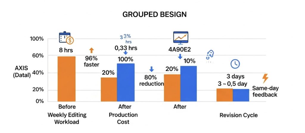 | Weekly editing workload | ~8 hrs | ~20 mins | 96% faster |