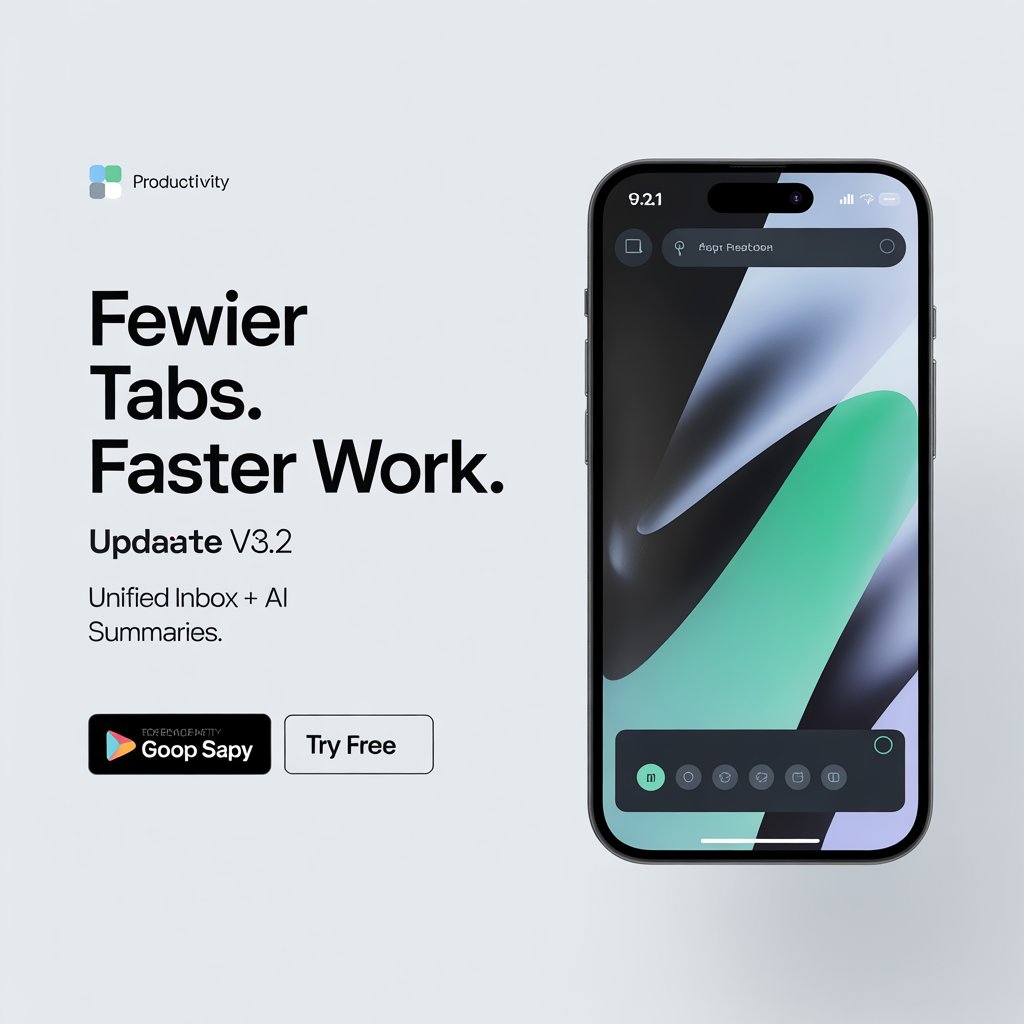 “Clean, modern ad for productivity app update v3.2. Headline: ‘Fewer tabs. Faster work.’ Subhead: ‘Unified inbox + AI summaries.’ Split layout: left text, right abstract app UI. Palette: cool gray, teal accent. Logo small, top-left. CTA: ‘Try free’. 1080×1080. Flat background, high contrast.”