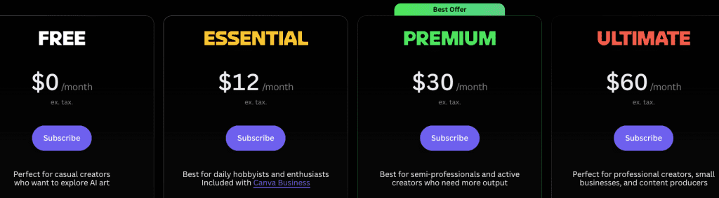 The Essential plan at $12/month is the sweet spot for most creators — you get priority speed, private generations, and enough tokens for consistent daily work.