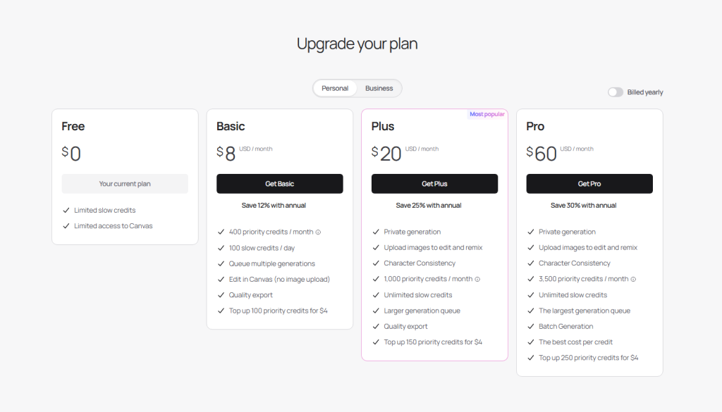 - Plus: $20/month (1000 images)