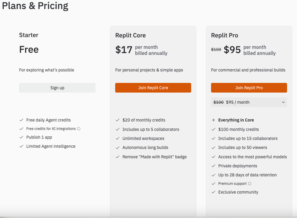 • Replit: Free tier is fine for small projects. Replit Core has hovered around $20/month for extras (more compute, private repos, AI credits). If you lean on AI generation and need faster machines for rendering, Core is the comfort tier. See the latest on Replit pricingor the account billing page.