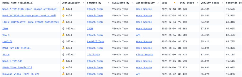 The proof is in the benchmarks. Wan 2.1 topped the VBench leaderboard — the standard evaluation framework for video generation models, covering 16 dimensions from motion smoothness to text alignment — as the only open-source model in the top five. Kling 3.0 holds the #1 ELO score in motion realism as of April 2026. Hailuo 2.3 just dropped with what MiniMax is calling a new cost-effectiveness record.