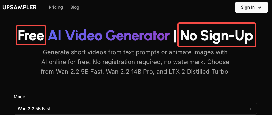 Upsampler indeed surprised me. The process is completely free, requires no sign-up, and the resulting videos are watermark-free. It runs Wan 2.2 5B Fast, Wan 2.2 14B Pro, and LTX 2 Distilled Turbo — all open-source models — giving you text-to-video and image-to-video generation from your browser.