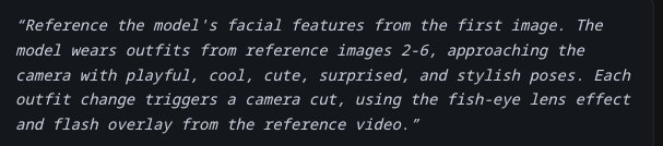 The wardrobe consistency matters more than you’d think. Specifying exact clothing items helps the model anchor the character. Vague descriptions (“casual outfit”) tend to drift between frames.