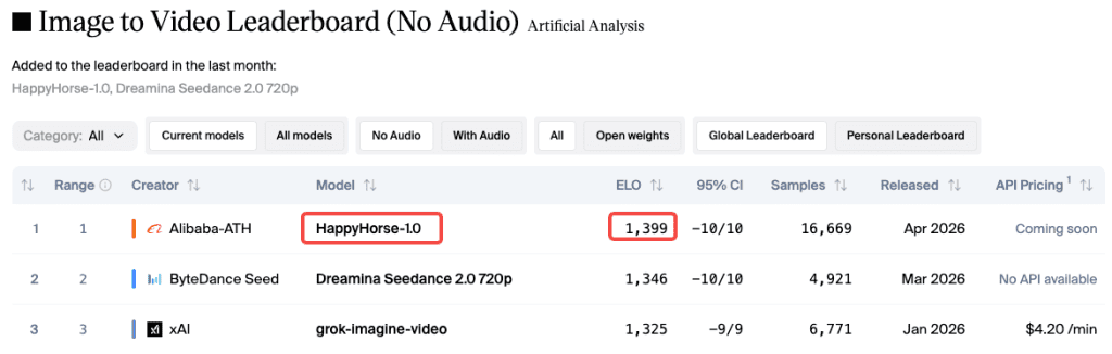 I check the Artificial Analysis video leaderboard about once a week. Two weeks ago, a model I’d never seen before was suddenly #1: HappyHorse-1.0. No team, no announcement—just an Elo score already climbing past 1366 (now around 1399).