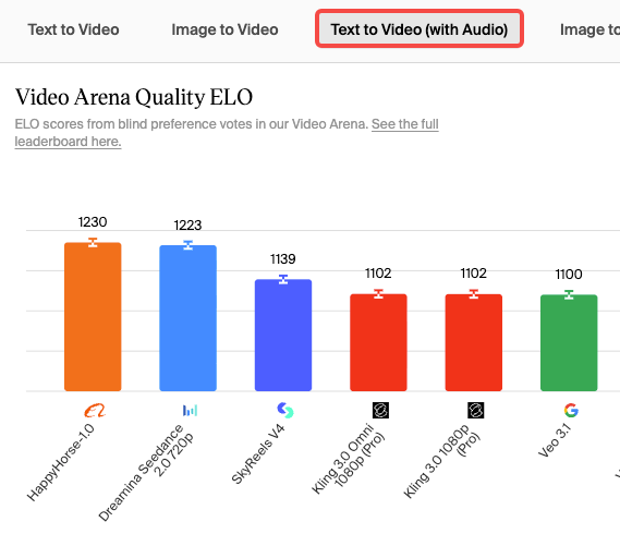 | Text-to-Video (with audio) | ~1,205–1,217 | ~1,214 (statistical tie) |