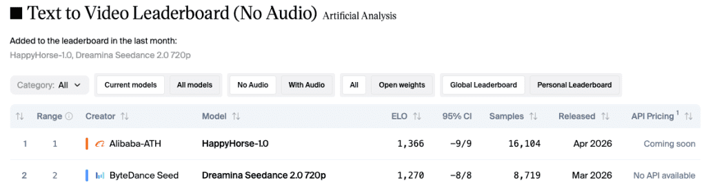 One caveat worth flagging: HappyHorse’s vote sample is smaller than Seedance 2.0’s established pool of 7,500+ votes in T2V. Newer models’ Elo scores are more volatile. The lead in silent categories is real and meaningful — the audio gap is a tight race and may shift.