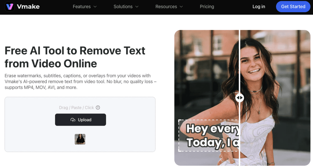 Go to vmake.ai/delete-text-from-video. Click upload or drag and drop your file. You can upload up to three videos at once if you have a batch to process—handy if you’re cleaning up a series of clips.