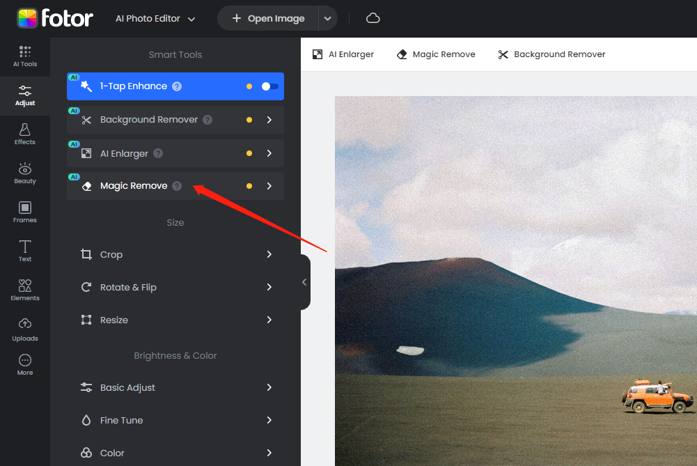 Fotor’s video text remover uses a brush-based selection approach. Instead of auto-detecting everything, you paint over the text you want removed and let the AI figure out what belongs underneath.