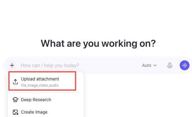 - Upload your image. Click the attachment icon below the text box. JPGs, PNGs, and WebP all work. Higher resolution inputs produce better output, but anything above 2000px didn’t make a noticeable difference.