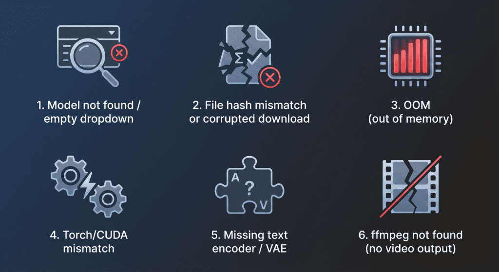 - Fix: Switch to distilled, lower resolution, fewer frames, or enable half precision if the node supports it. Close other GPU apps.