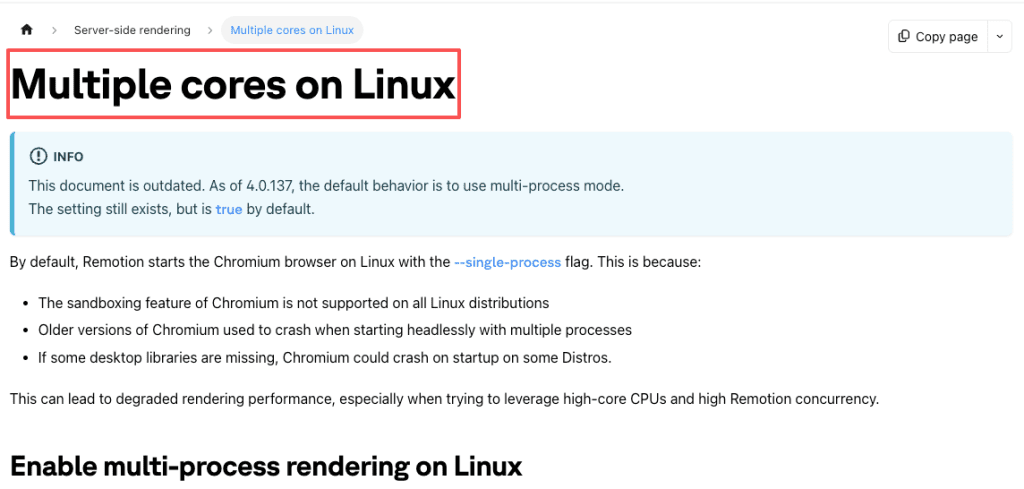 I tested this on February 10th. Without enableMultiProcessOnLinux, a 30-second video took 4 minutes to render. With it enabled? 1 minute 20 seconds. The difference is massive. This setting allows parallel video rendering across multiple CPU cores.