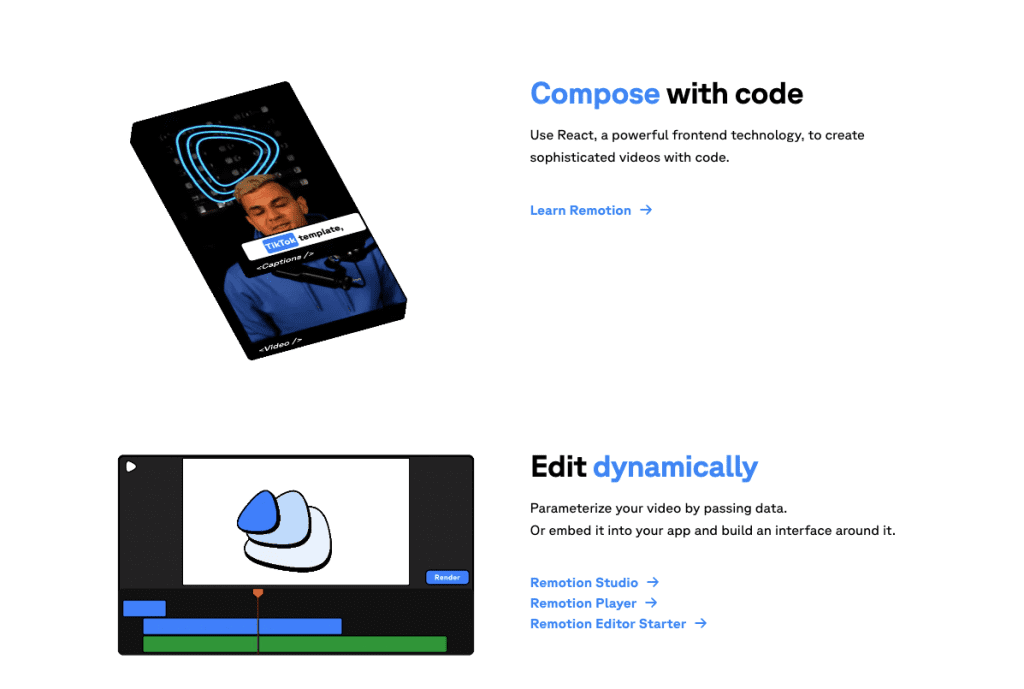 Remotion is an open‑source React framework that lets you build videos like web apps: components, props, hooks, timelines. Instead of keyframing in a timeline UI, you write functions, think useCurrentFrame() for timing, spring() for easing, and props for dynamic content. You can render locally or on Remotion Cloud when you need scale.
