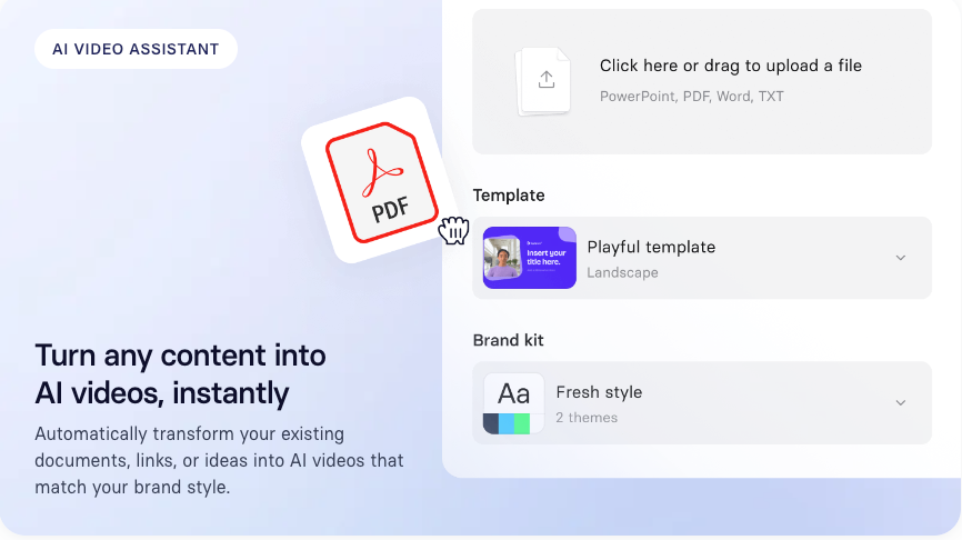 A: MP4 (H.264 codec) for standard embedding. If your LMS tracks completion and quiz performance, you’ll want SCORM 1.2 or xAPI format — Synthesia Enterprise and some Articulate integrations support this.