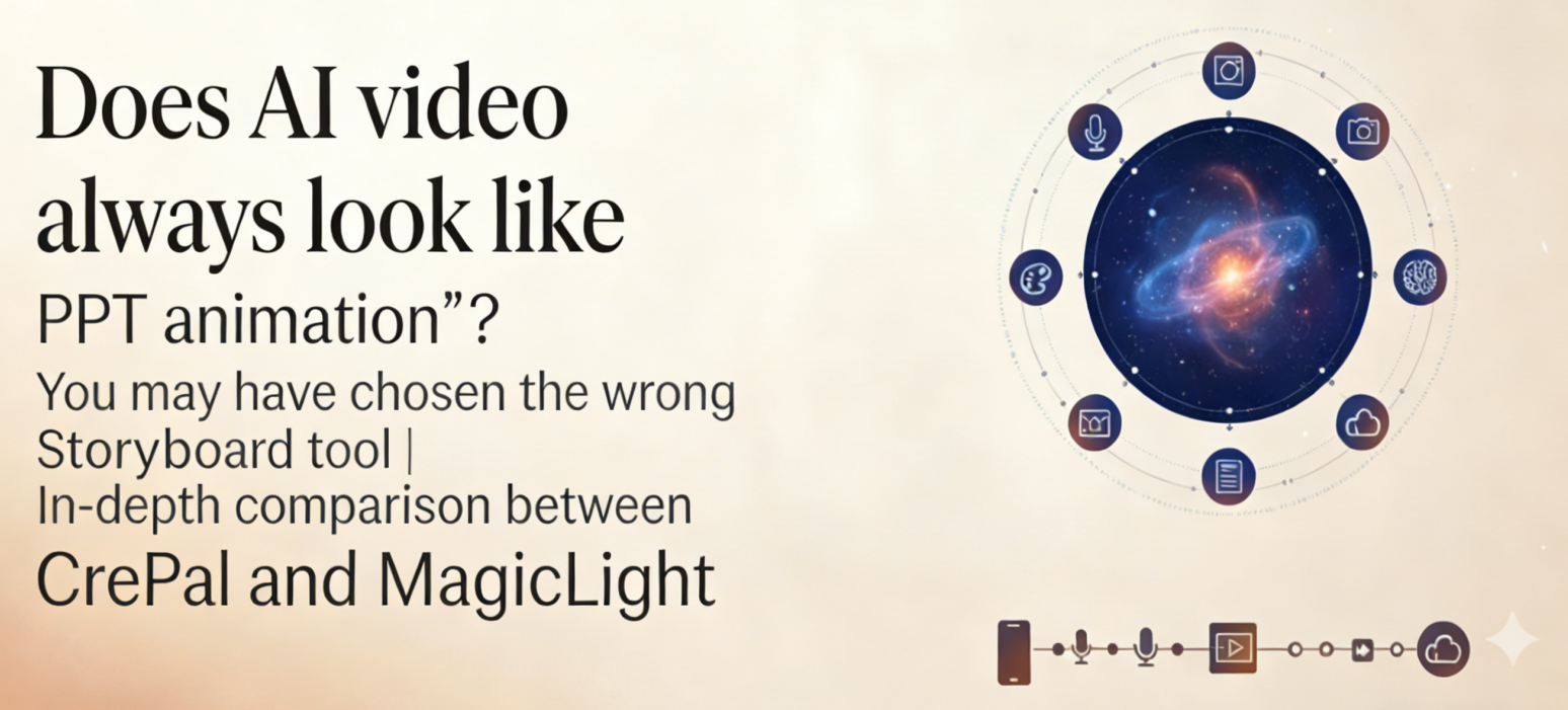 Today we conduct an in-depth comparison of two popular AI video tools: CrePal and MagicLight . Both have the Storyboard function, and their interfaces look somewhat similar, but their product positioning and final effects are completely different.