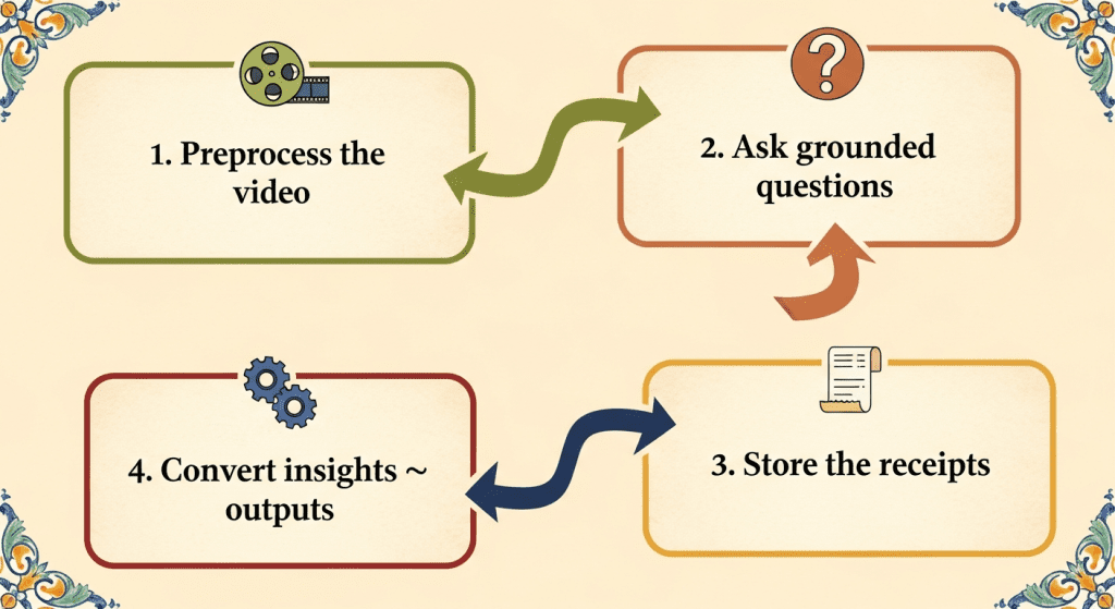 • Extract frames at a steady cadence (e.g., 4–8 fps) and keep audio if you need transcript alignment.