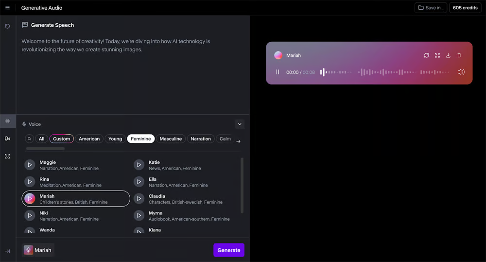 - Generate the voiceover from text. Pick a voice that matches the vibe, not just the gender. Neutral voices blend best with B‑roll.