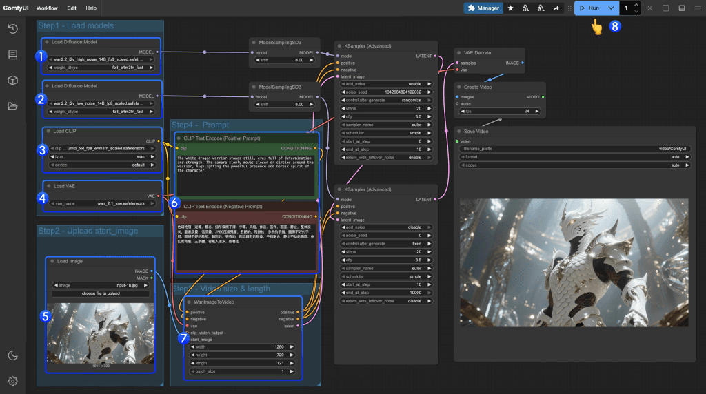 Steps: The Wan2.2 workflow defaults to 20–25 steps. Going above 30 rarely improves output quality for i2v — it just takes longer. If you’re using the Lightning LoRA variant, drop to 4 steps (as the workflow README from the ComfyUI examples repo specifies) and set split_step to 2.