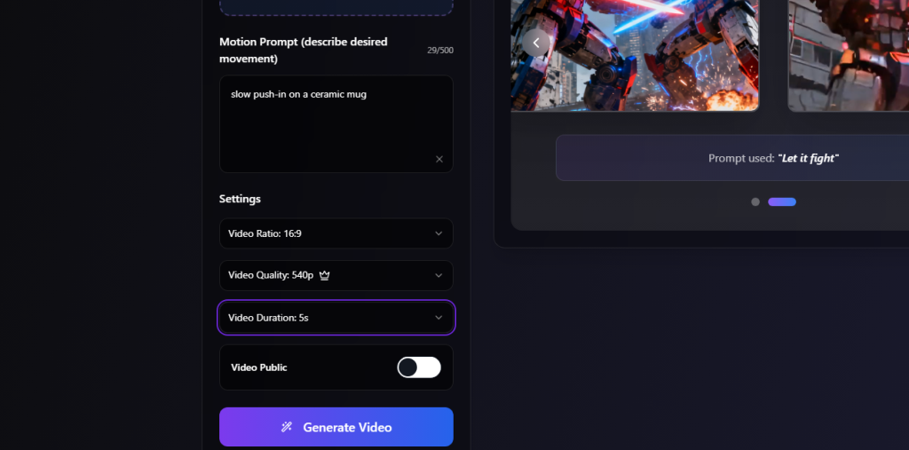This was the most reliable motion type in my testing. A slow push-in over 6–8 seconds adds polish to almost any scene. On Nov 13, I tried a coffee mug shot with the prompt: “slow push-in on white ceramic coffee mug, golden hour lighting, soft steam rising.” The mild zoom with ease-in delivered that “breath” you get from real cameras.