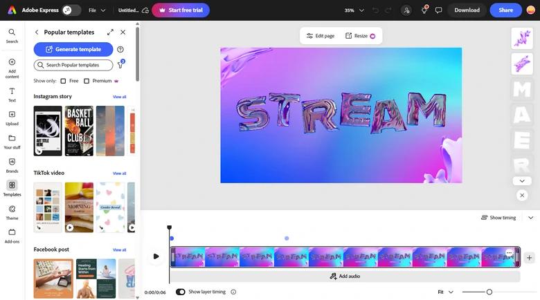 Adobe Express is the often-overlooked sibling in the Adobe family, and for free-tier montage work, it delivers something increasingly rare: no watermark on exports. The free plan lets you upload video footage and images to its timeline, then customize with royalty-free Adobe Stock music, fonts, icons, and graphics.